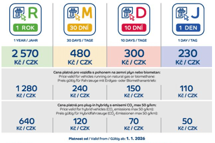 Od 1. ledna 2026 činí cena roční elektronické dálniční známky na základě zákonné valorizace 2 570 Kč, třicetidenní stojí 480 Kč, desetidenní 300 Kč a jednodenní 230 Kč. Poloviční cena platí pro vozidla s pohonem na zemní plyny (CNG a LNG) a biometan, čtvrtinová pro plug-in hybridy s emisemi CO₂ do 50 g/km. Vozidla s pohonem na elektřinu nebo vodík mohou dálnice využívat i nadále bez poplatku. Peníze z dálničních známek jdou zpět do výstavby a údržby dálnic a slouží těm, kteří je platí. Po zvýšení cen známek se očekává o miliardu vyšší výnos pro rok 2026, což znamená zhruba 9 miliard korun na stavbu a údržbu dalších kilometrů dálnic.